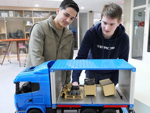 Gisteren was het een bijzonder leuke en interessante dag voor de derde en vierde klassers van het profiel Mobiliteit en Transport. De Roadshow is een initiatief van Sectorinstituut Transport en Logistiek, met de truck maken zij een tour langs diverse vmbo- en mbo-scholen. Ben Hendriks, initiatiefnemer van de Logistieke Roadshow: "We zien landelijk een daling in het aantal leerlingen dat kiest voor een logistieke opleiding. Met challenges in een aansprekend thema laten we leerlingen zien dat een logistiek beroep ontzettend interessant en leuk is. We maken daarnaast ook de koppeling met het bedrijfsleven door middel van masterclasses, gegeven door logistieke bedrijven. We hopen dat we een goed en positief beeld van deze sector kunnen neerzetten om zo de instroom bij logistieke opleidingen te verhogen."